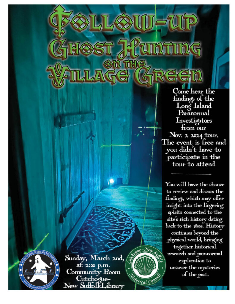 Hear the findings of the Long Island Paranormal Investigators from our November 2, 2024, tour. The event is free, and you did not have to participate in the November tour to attend. You will have the chance to review and discuss the findings, which may offer insight into the lingering spirits connected to the site’s rich history dating back to the 1600s. Don’t miss this chance to witness the evidence and explore the possibility that the past is still present. Presented by the Cutchogue New Suffolk Historical Council and Museums. Sunday, March 2nd, at 2:00 p.m., Community Room, Cutchogue-New Suffolk Library.