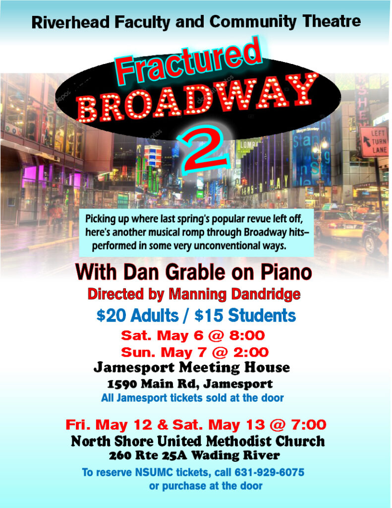 Riverhead Faculty and Community Theatre presents Fractured Broadway 2. Picking up where last spring’s popular revue left off, the show is another musical romp through Broadway hits performed in some very unusual ways. The revue performs at the Jamesport Meeting House, 1590 Main Rd, on Sat. May 6 at 8:00 and Sun. May 7 at 2:00; and the following weekend at the North Shore United Methodist Church, 260 Rte. 25A in Wading River on Fri. May 12 and Sat May 13 at 7:00 each evening. Tickets for