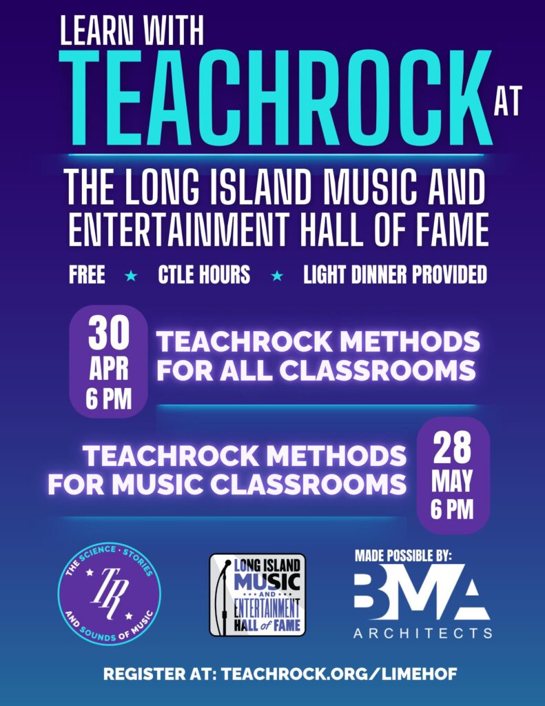 These workshops are made possible by BMA Architects. Teachers who wish to attend this free workshop at the Long Island Music & Entertainment Hall of Fame must register in advance at: https://teachrock.org/LIMEHOF/