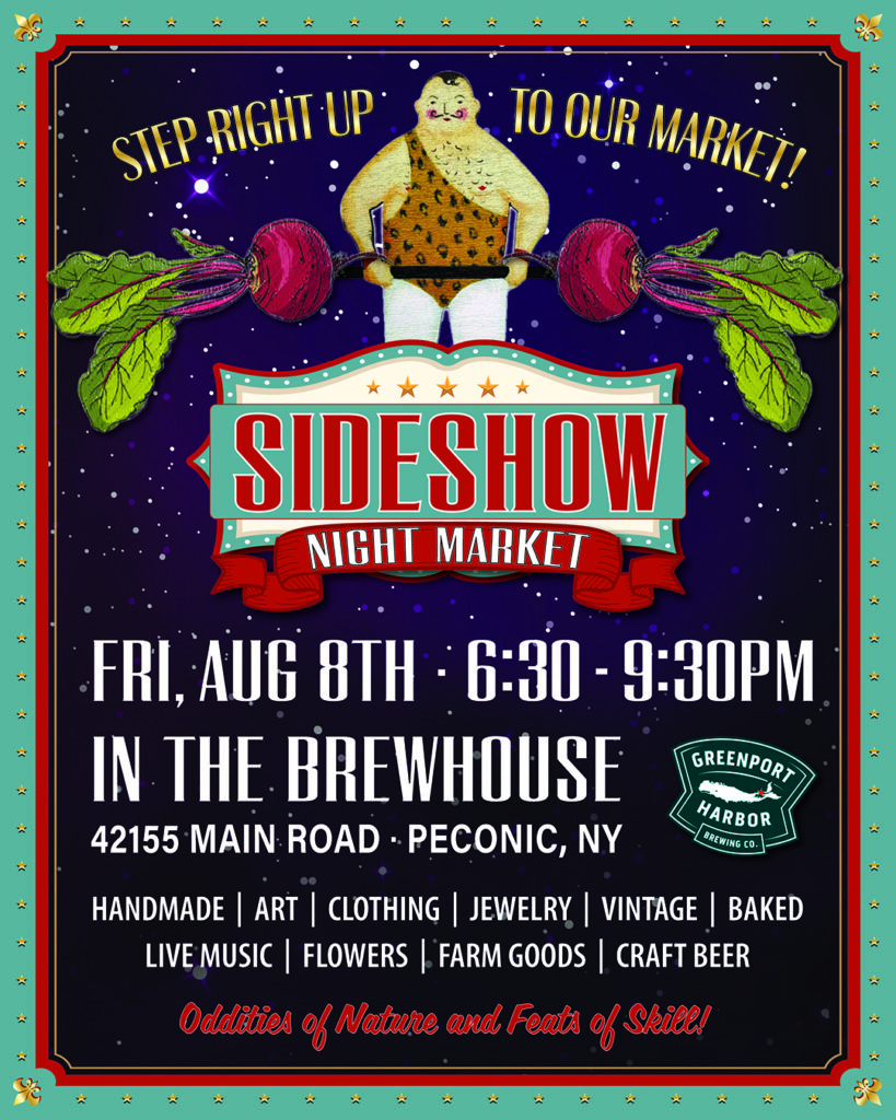 Looking for some Friday Night fun? Stop by our SIDESHOW Night Market at our 42155 Main Rd., Peconic location on FRIDAY, AUGUST 8TH from 6:30 – 9:30 pm! We will meet you IN THE BREWHOUSE!