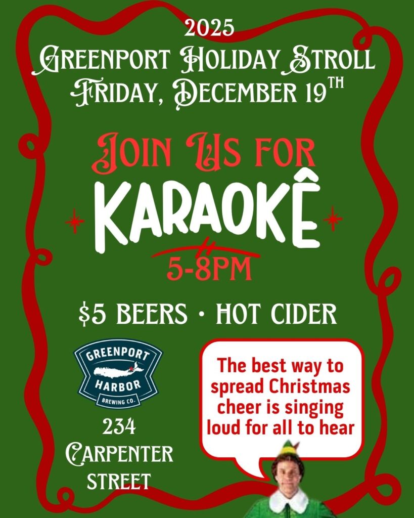 Join us during the Greenport Holiday Stroll on Friday, December 19 for karaoke from 5–8 PM at the original GHBC, 234 Carpenter St. $5 beers and hot cider with all the fixings available!