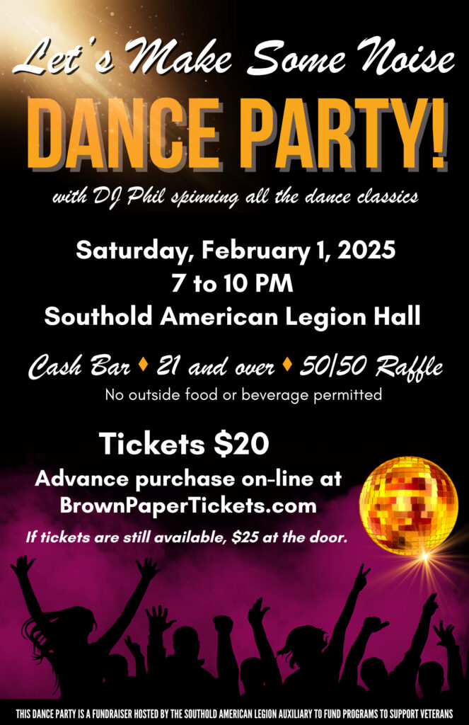 The Southold American Legion Auxiliary invites adults ages 21 and older to shake off their winter blues at a “Let’s Make Some Noise” dance party and fundraiser on Saturday, February 1 from 7 to 10 p.m. at the Southold American Legion Hall, 51655 Main Road in Southold. The dance party will feature classic and current dance music presented by high-energy DJ Phil, a cash bar, and a 50/50 raffle. No outside food or beverages will be permitted. Tickets are $20 in advance and may be purchased online at www.BrownPaperTickets.com. Tickets at the door will be $25, as-available. Proceeds from the dance party will help fund Southold American Legion Auxiliary veterans support initiatives.