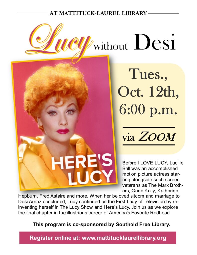 Before I LOVE LUCY, Lucille Ball was an accomplished motion picture actress starring alongside such screen veterans as The Marx Brothers, Gene Kelly, Katherine Hepburn, Fred Astaire and more. When her beloved sitcom and marriage to Desi Arnaz concluded, Lucy continued as the First Lady of Television by re-inventing herself in The Lucy Show and Here’s Lucy. Join us as we explore the final chapter in the illustrious career of America’s Favorite Redhead. This program is co-sponsored by Southold Free Library.