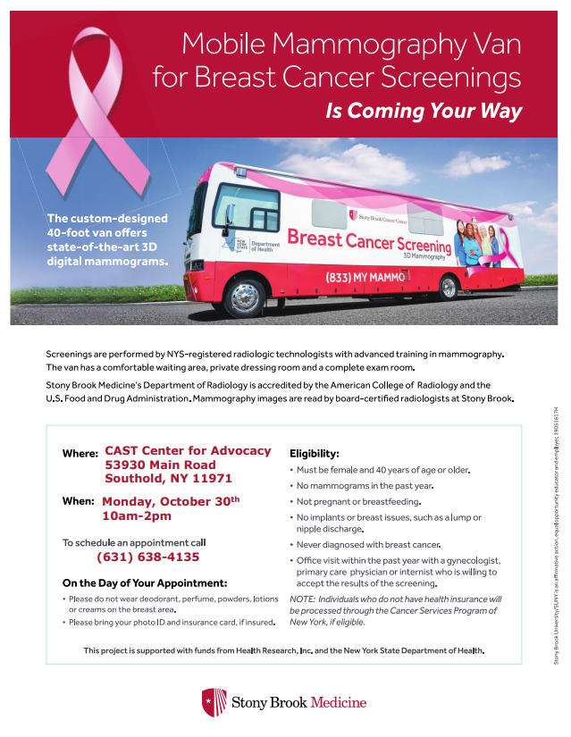 Screenings are performed by NYS-registered radiologic technologists with advanced training in mammography. The van has a comfortable waiting area, private dressing room and a complete exam room. Stony Brook Medicine department of Radiology is accredited by the American College of Radiology and the U.S Food and Drug Administration. Mammography images are read by board-certified radiologists at Stony Brook.