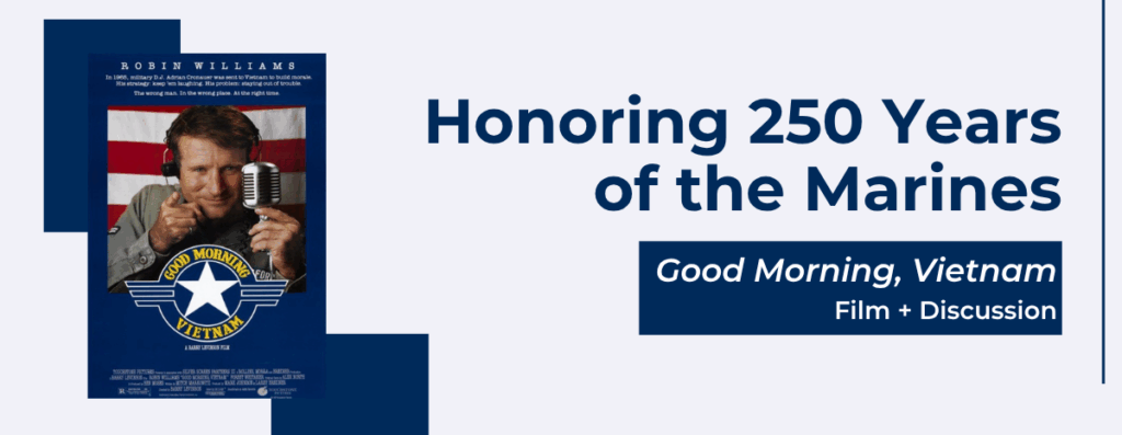 Join us for a special evening commemorating the 250th anniversary og the United States Marine Corps. We’ll be screening Good Morning, Vietnam, the beloved 1987 film starring Robin Williams as an irreverent radio DJ who brings laughter and heart ot the soldiers stationed overseas.