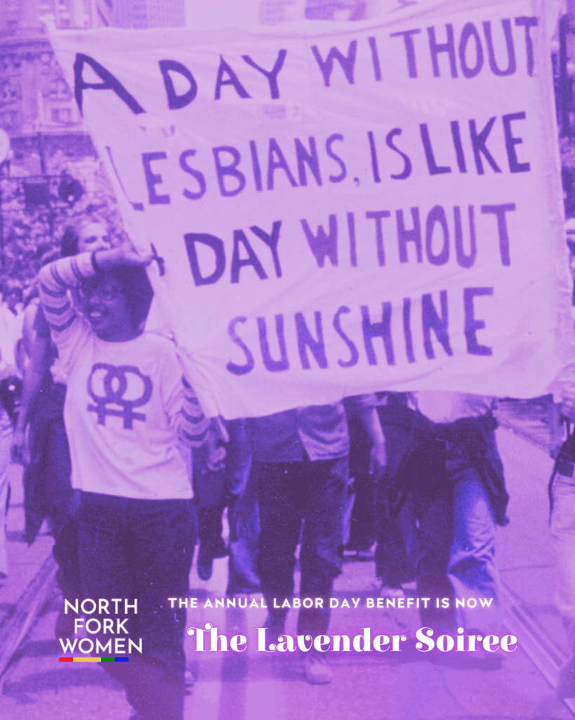 North Fork Women hosts its annual Labor Day Benefit, the Lavender Soiree, honoring the legacy of the Lavender Menace who fought for lesbian visibility and rights during the women’s rights movement and celebrating the power of sapphic women and community. Allies are welcome! Evening includes passed appetizers, catered buffet, music, and fundraising to provide medical and emergency grants to lesbians and queer women facing financial barriers, disability, illness, crisis, or aging and in need of assistance for medical life alerts or underinsurance.