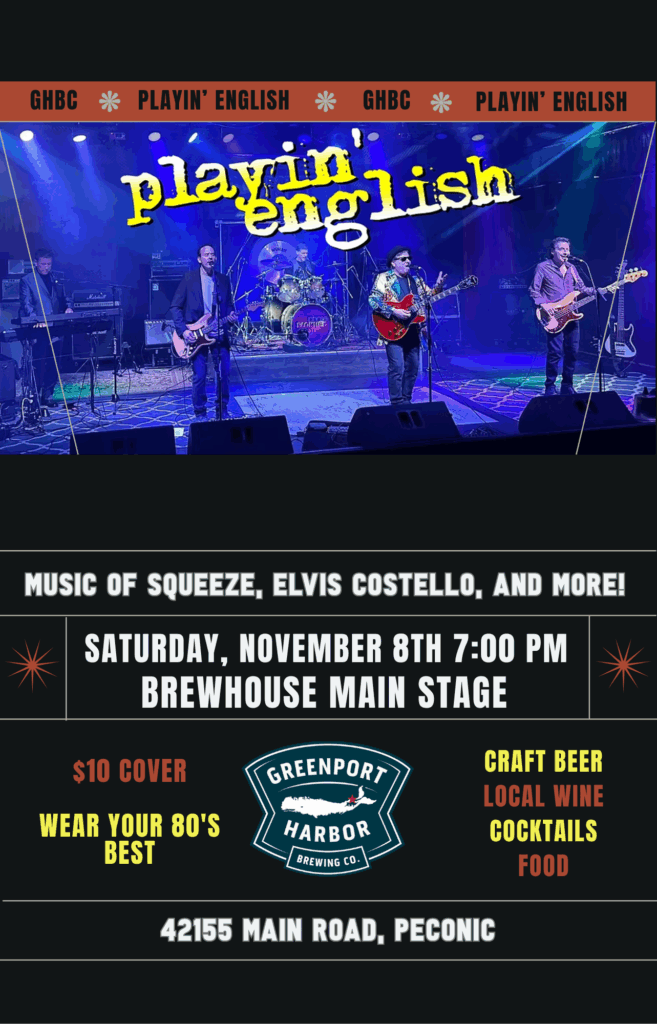 Playin’ English is coming to Greenport Harbor Brewing in Peconic THIS SATURDAY from 7-10pm.
