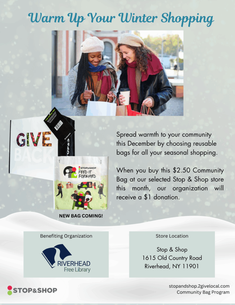 Riverhead Free Library has been selected as a beneficiary of Stop & Shop’s Community Bag Program for the month of December. For every $2.50 reusable Community Bag purchased at the Stop & Shop located at 1615 Old Country Road in Riverhead, the library will receive a $1 donation. The program supports local non-profits while encouraging the use of environmentally friendly, reusable bags.
