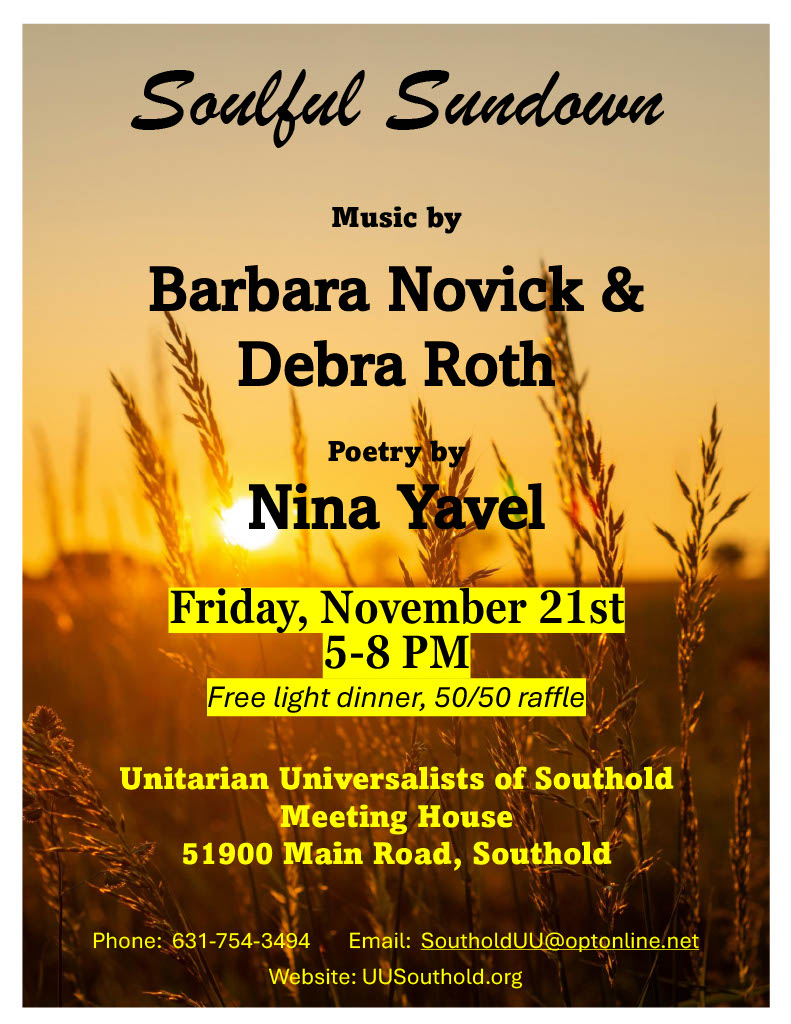 Please join us on Friday, November 21, at 5pm for our next Soulful Sundown featuring the musical talents of Barbara Novick and Debra Roth, with original poetry by Nina Yavel.