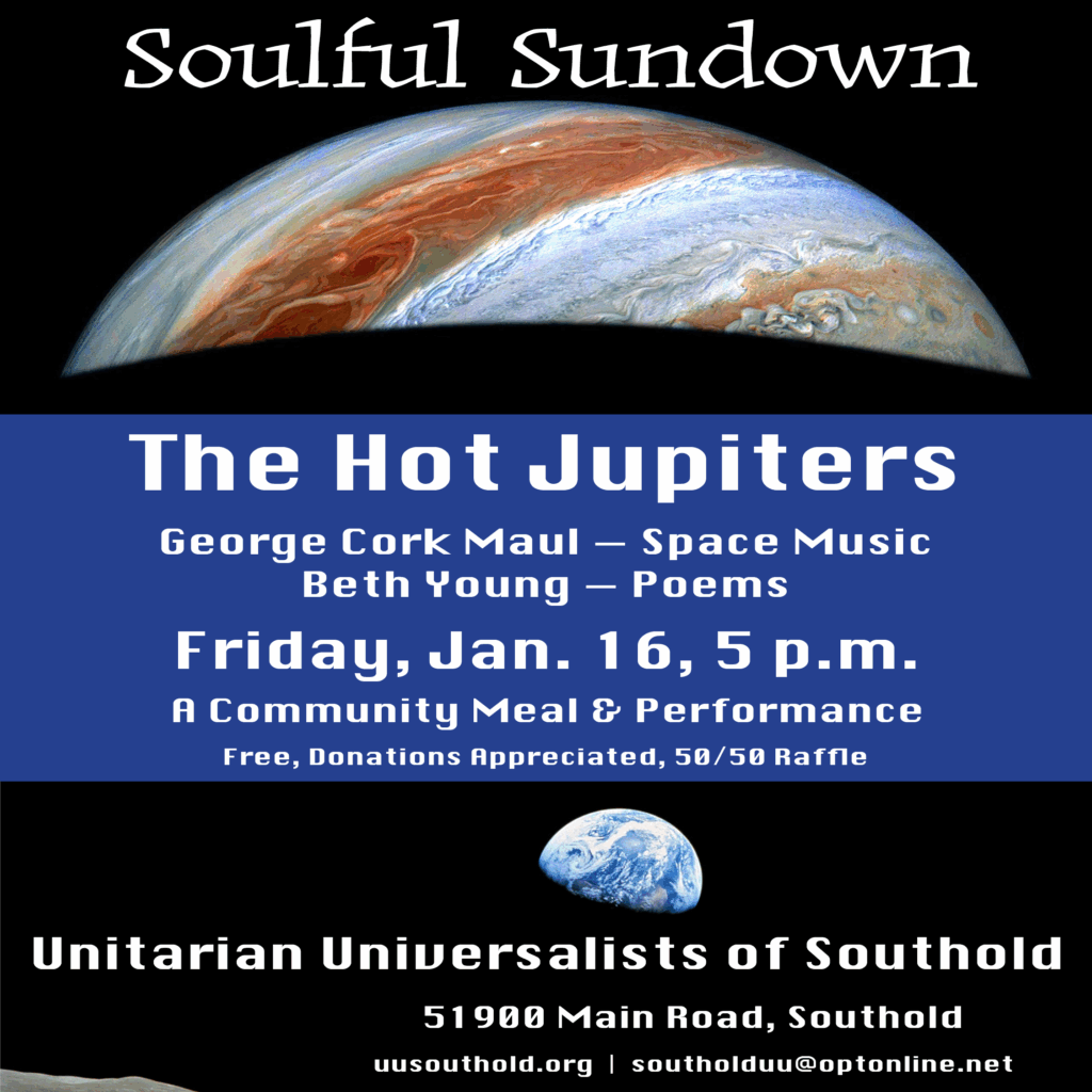 George Cork Maul will perform space music and Beth Young will perform poetry at this community meal and performance at the Unitarian Universalists of Southold.