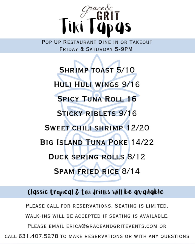 Let’s get some respite from the doldrums of winter and begin to think of warmer weather! Join us at Grace & Grit for our first Tiki Tapas pop up. Tasty small plates and fun tiki cocktails. Take out or dine in available. Email erica@ graceandgritevents.com for a reservation.