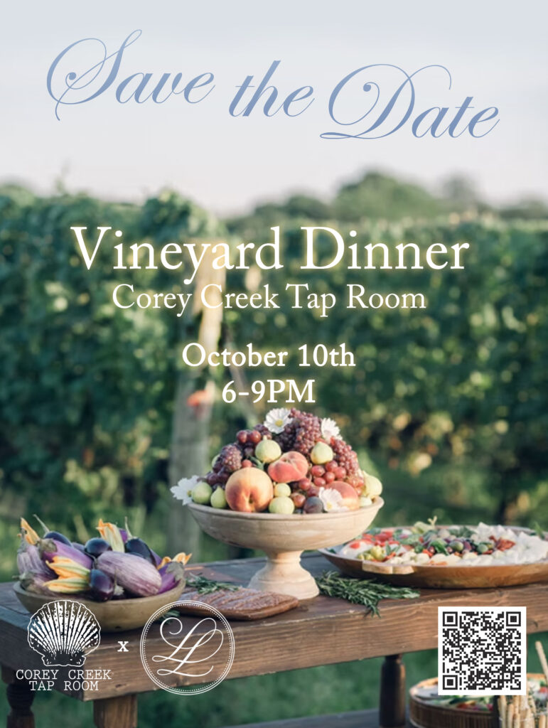 We’ll begin with a cocktail hour featuring a selection of passed hors d’oeuvres, then, three courses thoughtfully paired with Corey Creek wines by Marin Brennan.