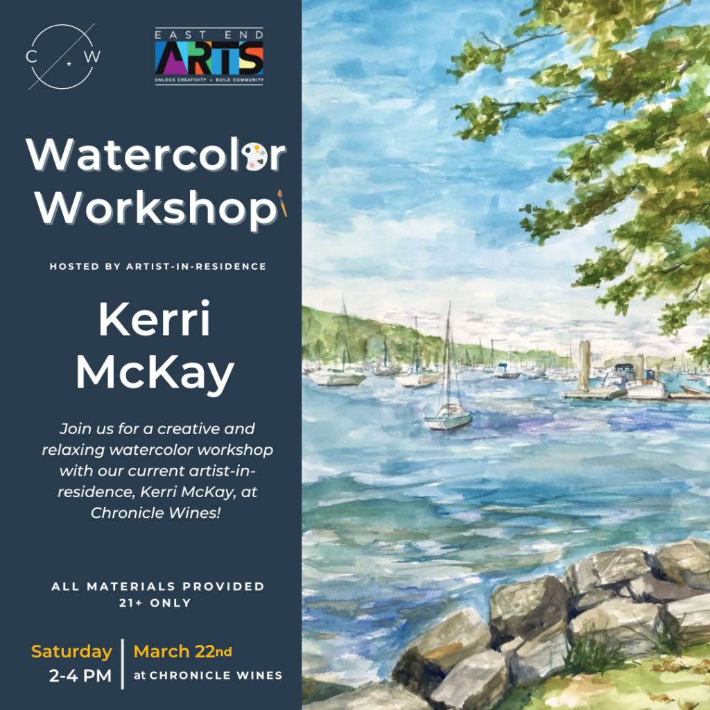 In partnership with East End Arts, join us for a creative and relaxing watercolor workshop with our current artist-in-residence, Kerri McKay, at Chronicle Wines! Immerse yourself in the beauty of watercolor painting as you explore techniques for blending, layering, and creating stunning compositions. In this hands-on session, you’ll paint your own unique piece while learning about the history and expressive nature of watercolor art. Sip on a glass of Chronicle Wine as you unleash your creativity—no experience necessary! All materials provided, and all artistic levels are welcome! 21 please!