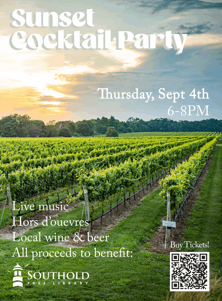 Join the Friends of the Southold Free Library at Bedell Cellars for a Sunset Cocktail Party on Thursday, September 4th! Enjoy live music & sustainable wine, local beers, cheeses & charcuterie whilst overlooking the pristine vineyards at Bedell.